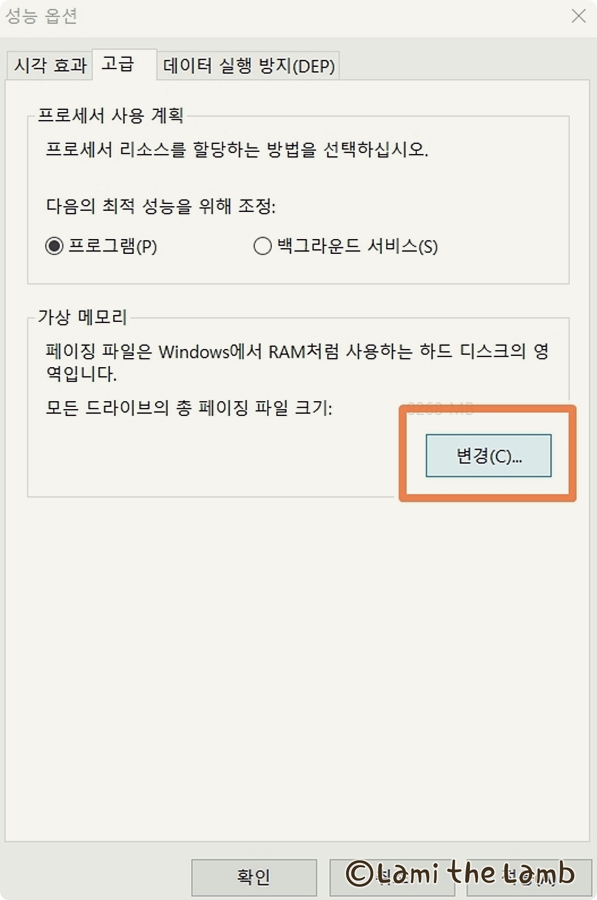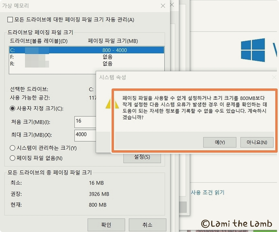 기본 옵션은 C:에서 '시스템이 관리하는 크기'던가 제일 상단의 체크박스가 체크되어있을거예요.