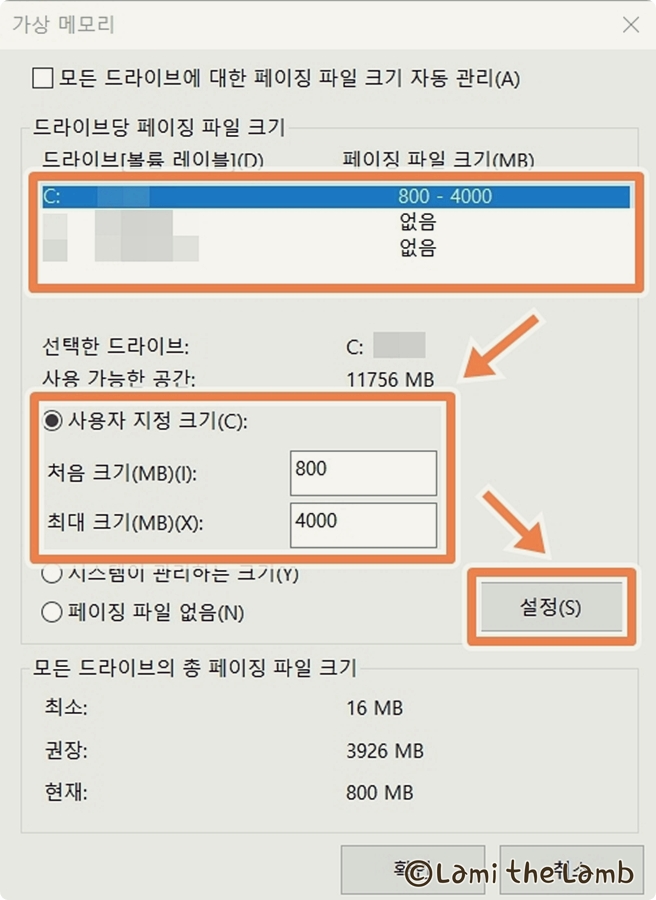 페이지 파일을 다른 드라이브로 옮길 때는 c:를 '페이징 파일이 없음'으로 설정하고 다른 넉넉한 드라이브에 '시스템이 관리하는 크기'나 '사용자 지정 크기'를 설정해주시면 됩니다.