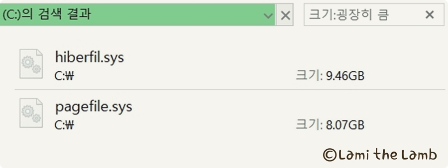 혹시나 하고 C: 전체에서 용량 기준으로 검색을 해보니 루트 폴더에 바로 잡히는 무시무시한 파일 두 개. 합치면 18GB 가까이 되네요. 그러고보니 이번에 포맷한 뒤로 얘들 정리를 안해줬어.